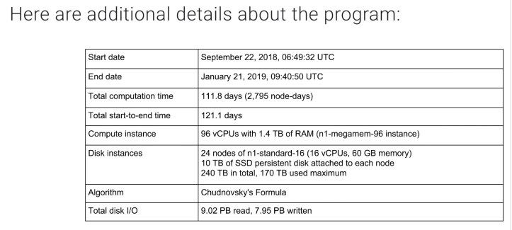 It was Pie day yesterday, and Google had to show off. One of their employees put a computer to work for more than 100 days to calculate the first 31,415,926,535,897 or π×10¹³ digits of the irrational number. Some numbers about the new Guinness World Record, for anyone interested: